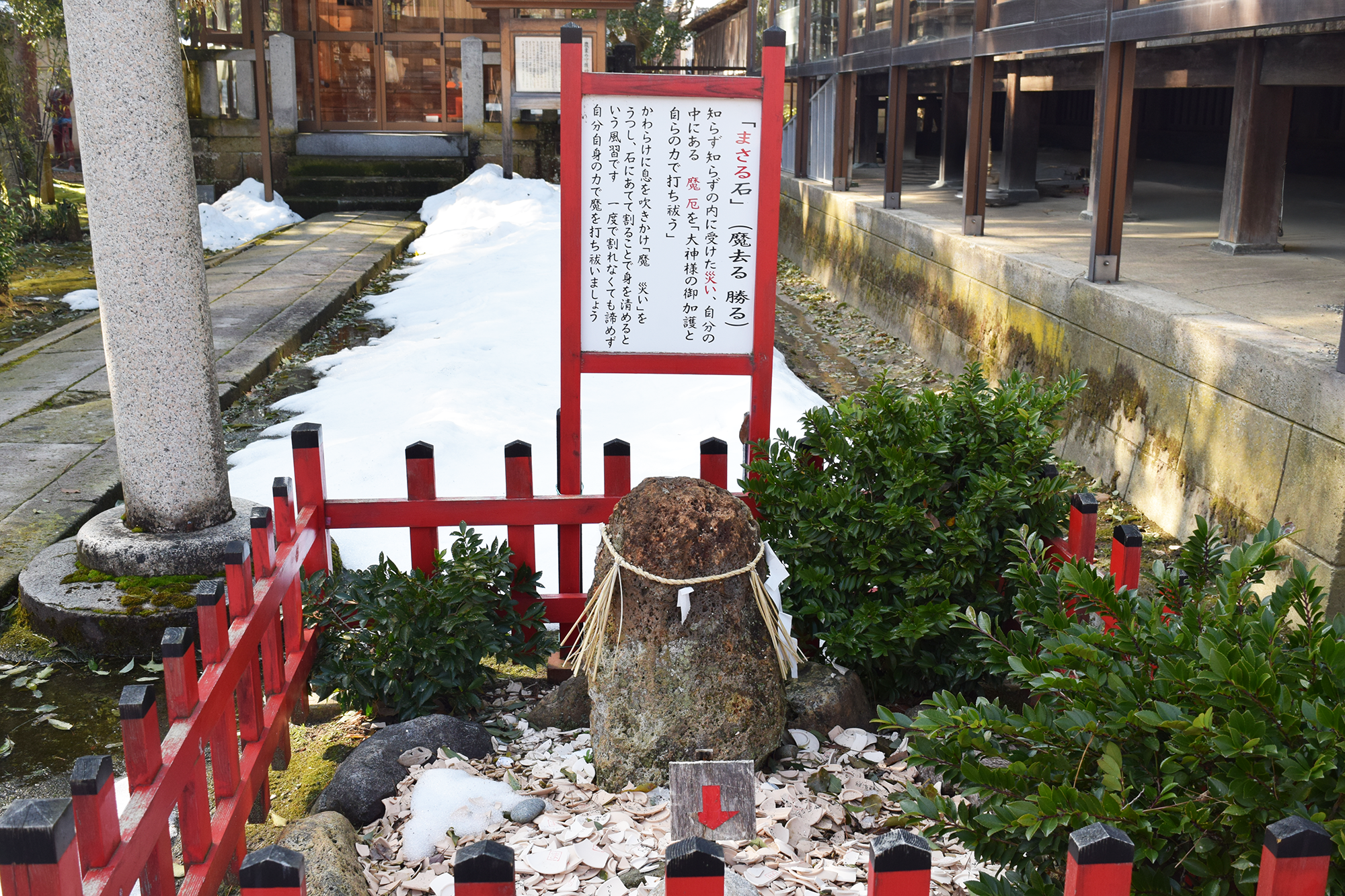 かわらけに願意を記入し、息を吹きかけ「魔・災い」をうつし、石にあてて割ることで身を清めると言う風習です。